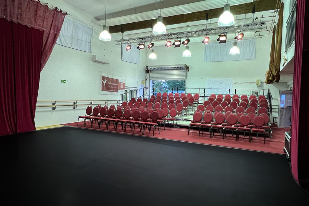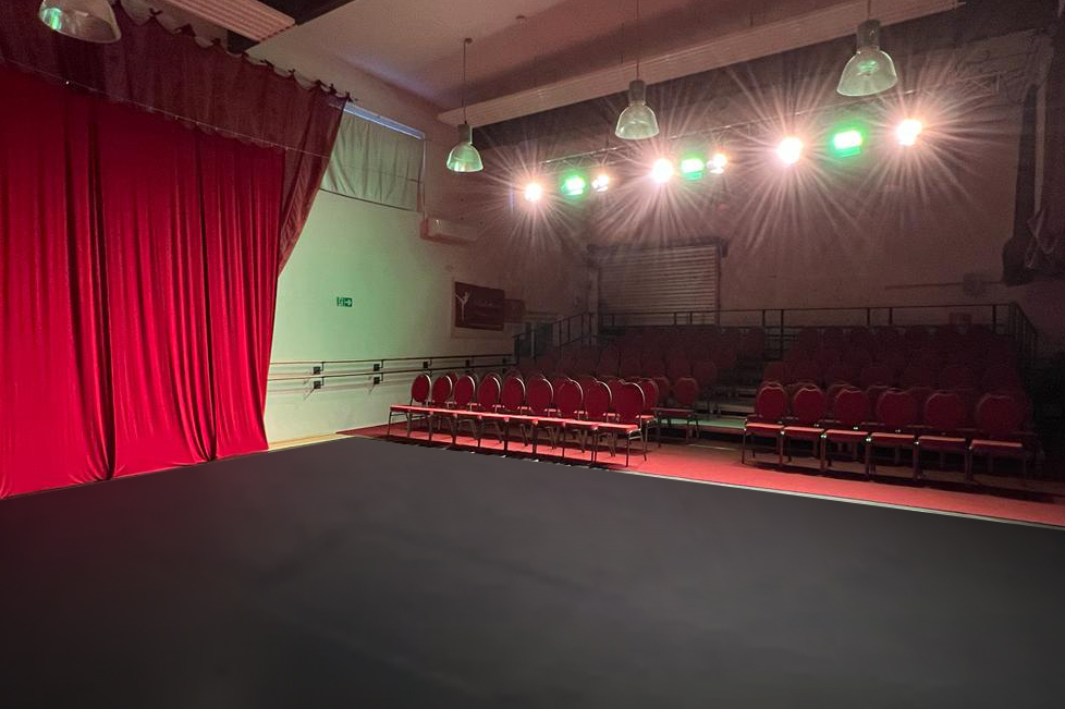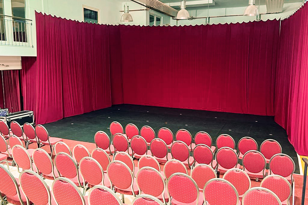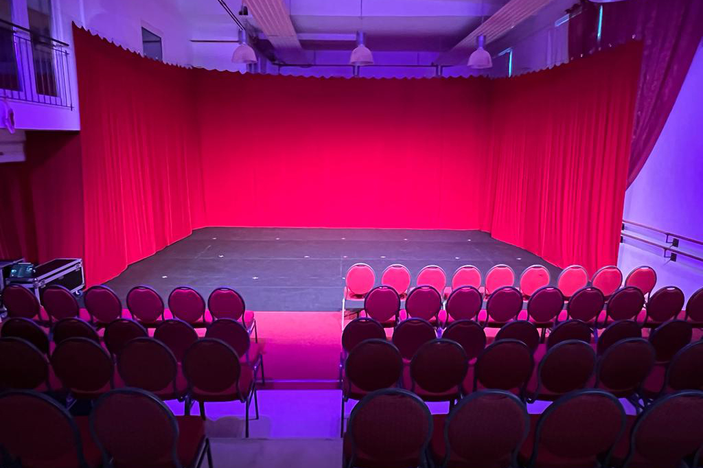 Seit 2022 besteht die Möglichkeit den großen Ballettsaal in ein Theater zu verwandeln. Festinstallierte Scheinwerfer, Theaterspots und Vorhänge als Bühnenkulisse ermöglichen schon im Unterricht das besondere Gefühl einer Aufführung. Im Handumdrehen können wir von den Proben so in die Situation einer Vorstellung wechseln.